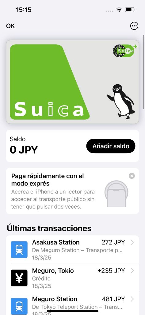 Además, puedes ver tu historial de viajes y el saldo directamente desde Wallet (iPhone) o la app de Suica (Android).